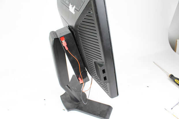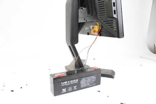 Ahora, vuelva a colocar el monitor a la base y conecte la batería (ocupándose de la polaridad positiva/negativa!).  La luz de fondo debe encendido y se ilumina la luz de fondo impresión.  Una vez que está funcionando, use velcro para fijar la batería en la parte posterior del monitor fuera de sitio.
