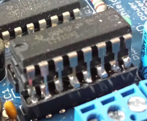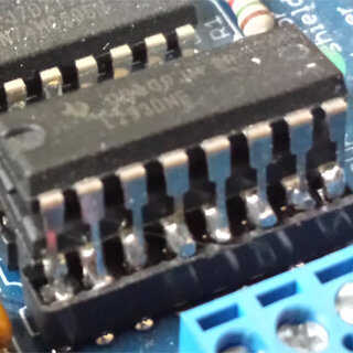 Así que la idea es soldar otro chip L293D directamente encima de la actual. PIN PIN que claro esto pone los dos chips en paralelo el voltaje seguirá siendo el mismo pero el amperaje se duplica. Estos chips son clasificados en sobre 600 mA continua o hasta 1.2A durante un corto período. Ahora se manejan 1.2A continua y 2.4A para períodos cortos.