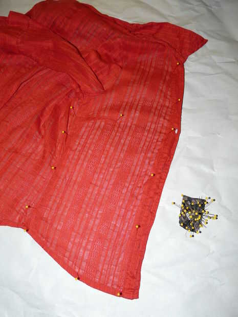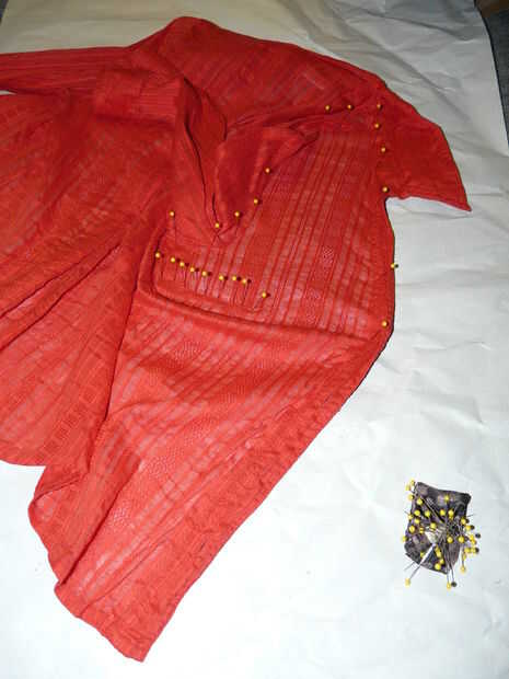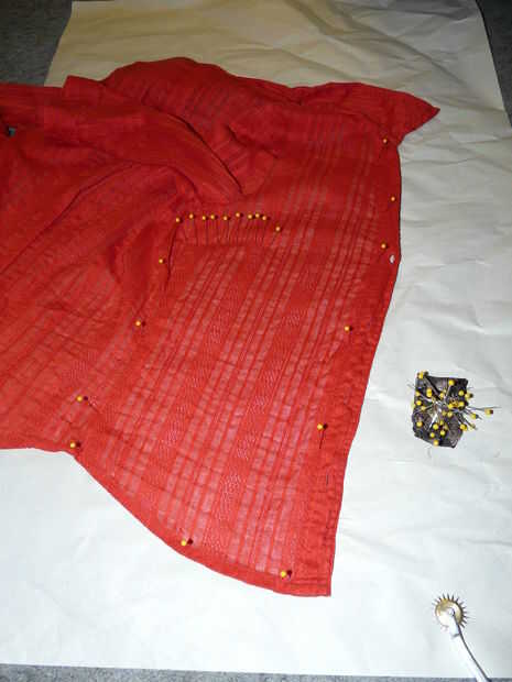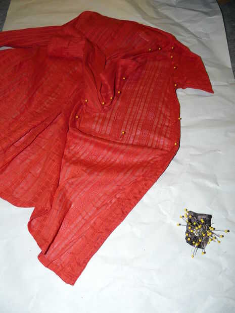 La camisa roja tiene dardos puntas solo, lo que significa que terminan en una línea de costura. Para rastrear estos, coloque un alfiler justo en el punto del dardo (en el final de la costura que sujeta el dardo cerrado). Ancla la prenda bajo el dardo a la superficie acolchada. La tela sobre el dardo se frunza y rumple, pero que está bien. Ahora traza la parte que han anclado, incluida la línea de costura del dardo.