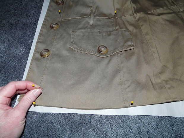 Fondear la pieza de tela a lo largo de las líneas de costura, para que quede plana. Yo sólo apuñalar pernos completamente a través de la costura, a través del papel y en la superficie acolchada. No estire a la tela, pero que sea lisa y plana. No se preocupe el resto de la prenda; simplemente muévalo fuera de su camino. Sólo vamos a ser una pieza de rastreo a la vez.