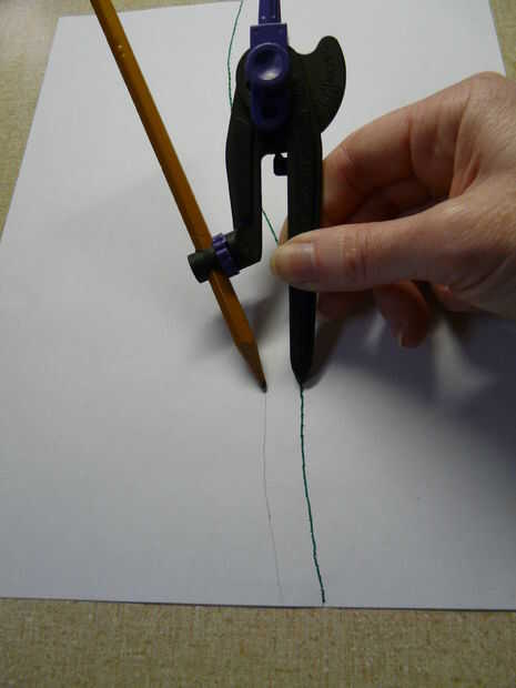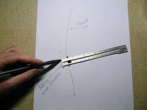 Si desea agregar el margen de costura en el patrón de papel sí mismo, hacerlo antes de cortar las piezas del patrón. Alinee 5/8" marca de una regla con la línea de puntos y sorteo de permiso de la costura alrededor de todo el camino. (Si desea un ancho diferente de margen de costura, entonces utilice la marca apropiada en la regla.) Mover la regla realmente a menudo para asegurarse de que sus líneas son suaves y precisos. Puede también establecer una brújula a la anchura de su margen y trazar cuidadosamente a lo largo de la línea de perforado con la punta de la brújula. El compás lápiz dibujará el margen de costura en el papel exactamente como vas.