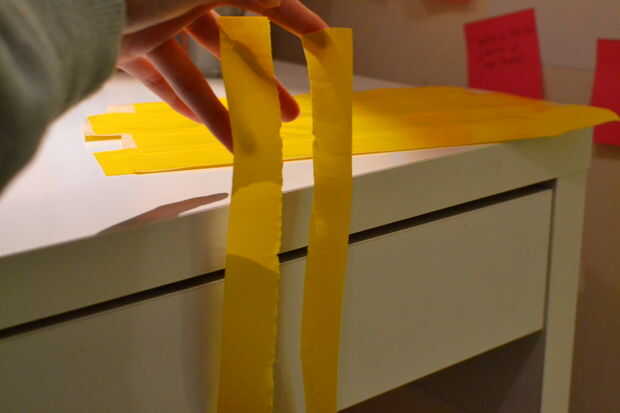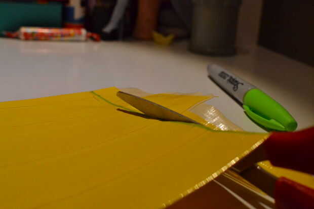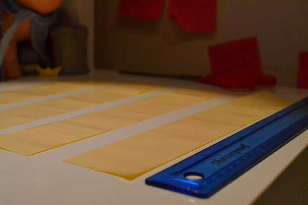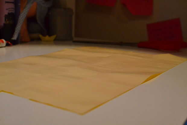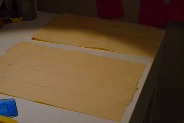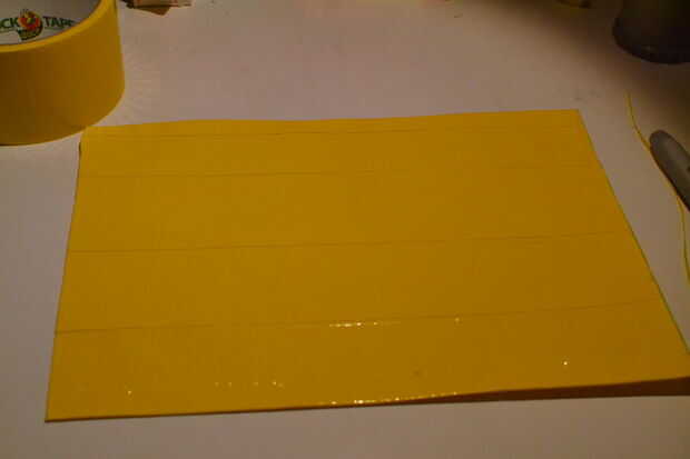 Cut four 10" pieces of tape. Cuidadosamente se superponen les acerca un centímetro para hacer una hoja. Hacer otra hoja. Coloque cuidadosamente una hoja encima de la otra para hacer la "tela." Corte otro 10" pieza de la cinta y hacer un pequeño corte alrededor de la mitad de la anchura a través de. RIP la tira por la mitad, pero él rápidamente o no funcionan. Si lo prefiere, corte en su lugar. Ahora tendrás dos 10" por las tiras de 1". Poner las tiras en los extremos de la hoja y pliegan para que cubren los bordes expuestos. Cortar la hoja hasta 9"(para igualar los bordes).