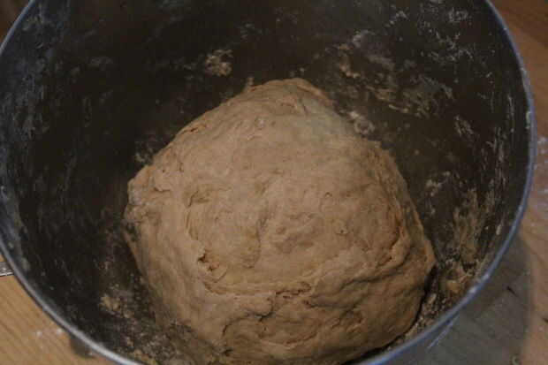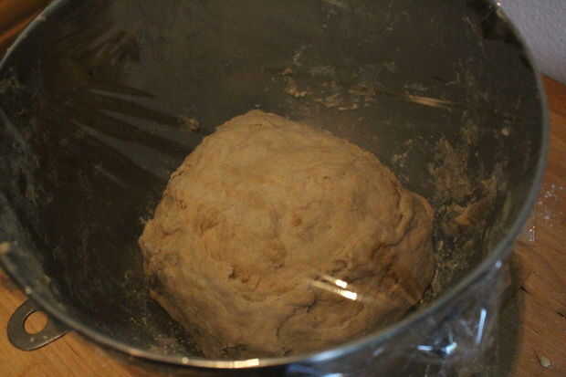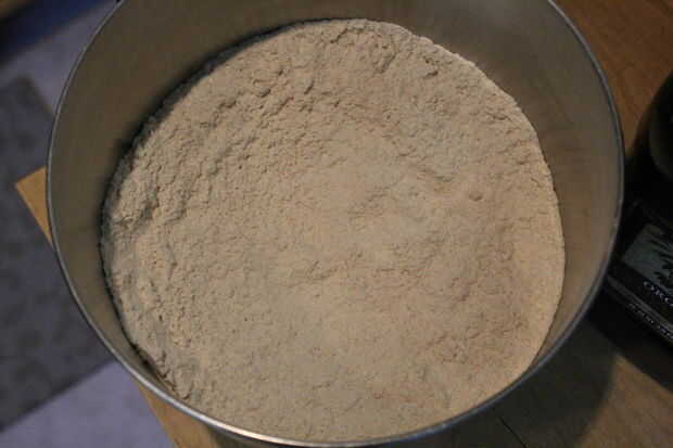En un bol o batidora, mezclar harinas. Luego agregar suero de leche, vinagre de manzana, media taza de agua y aceite. Mezclar y remover hasta que espesa, dura y homogénea. Plástico envolver el recipiente y deje reposar sobre el contador durante la noche. (12-24 horas).