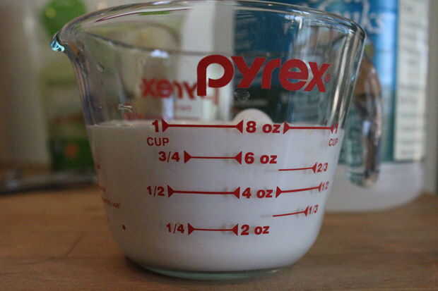 Si no tienes 1 taza de suero de leche, entonces usted puede hacer algunos; en un plato medición líquida 1 taza, vierta 1 cucharada de vinagre. Luego llenar el resto de la taza con leche. Dejar reposar por unos minutos, o hasta que la cuajada.