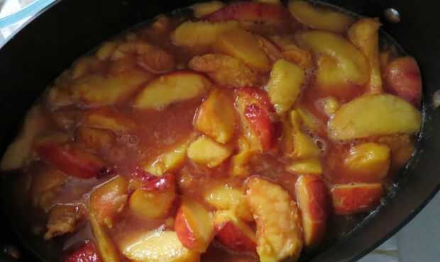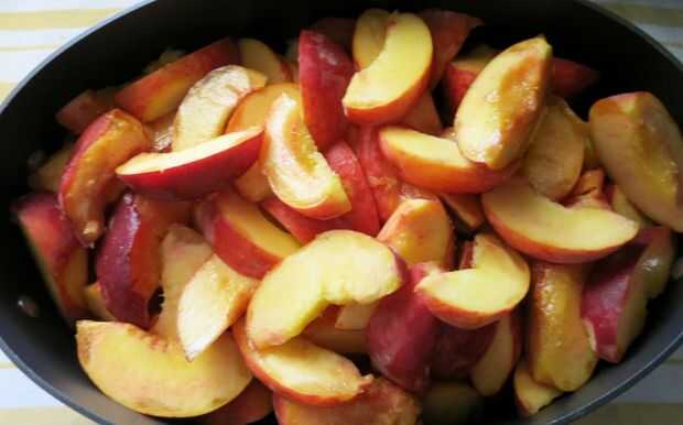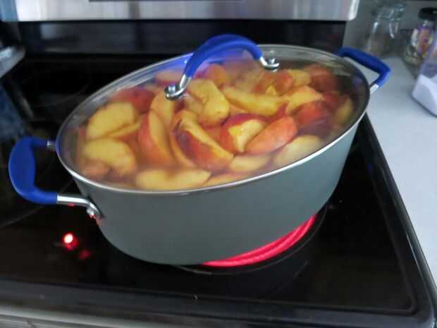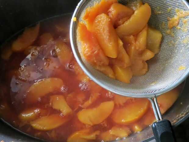 Encontrar la manera más fácil de duraznos del hoyo es utilizar una cuchara de pomelo, los filos aserrados ayudan también a obtener el área más duro alrededor del hoyo. Luego cortar en rodajas y añadir a la olla pesada de 8-10-cuartos.