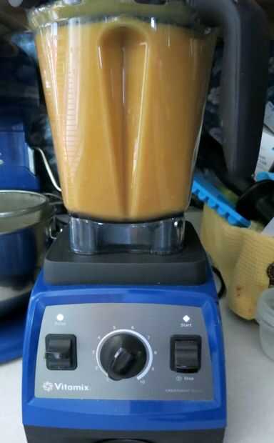 Debido a una abundante cantidad de líquido salió de mi duraznos cocidos utilicé un colador para transferir los melocotones ablandados a mi licuadora, de lo contrario el puré habría tomado días cocinar abajo. Usando una batidora, licuadora o molino del alimento, puré de mezcla de duraznos, en tandas, hasta que esté suave (usted debe tener alrededor de 14 tazas puré).