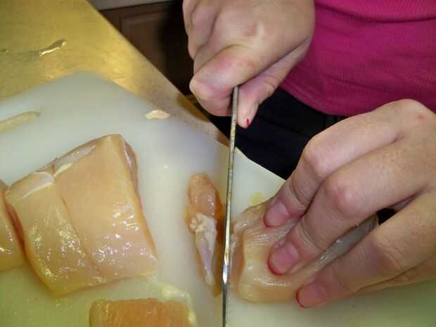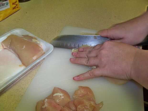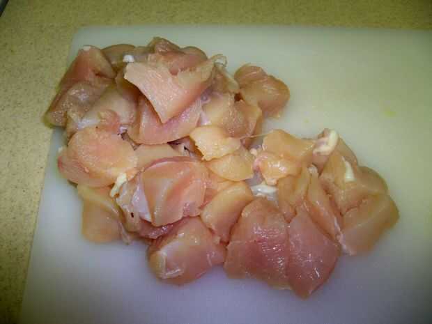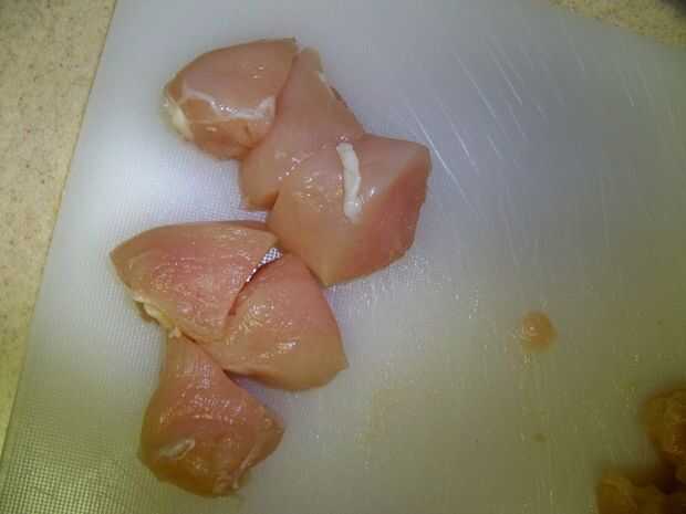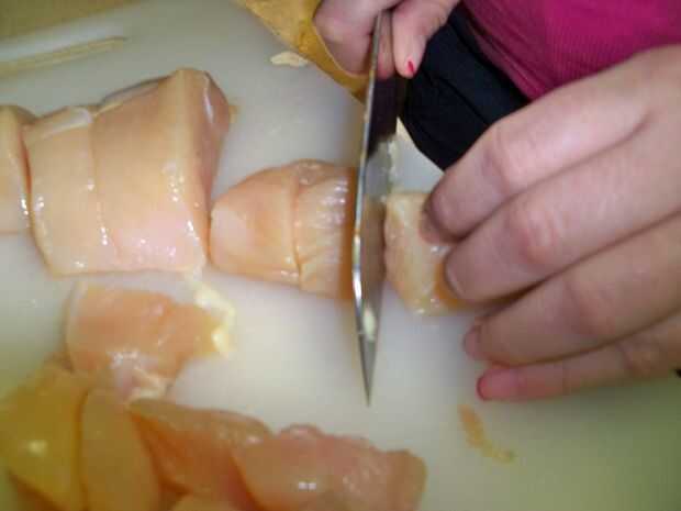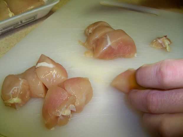 Primero, corte el pollo en trozos de tamaño bocado, recorte lejos cualquier izquierda sobre grasa o piel