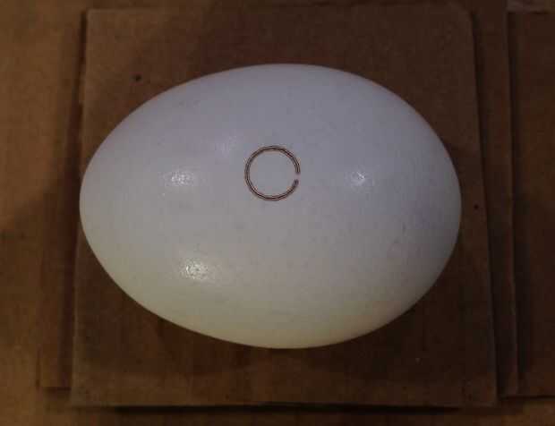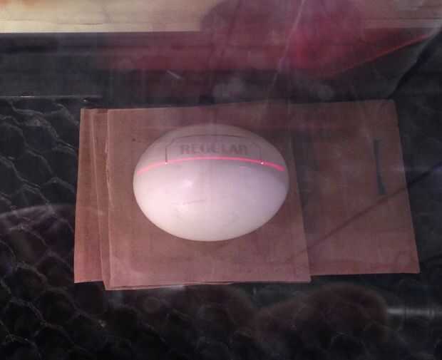 Para el grabado configurar el láser para 100% de potencia y 75% de velocidad.  Para cortar usé 100% energía y 1% de velocidad.  Tenga en cuenta que el huevo no salpique durante el corte, es solo reflejo en el escudo claro.