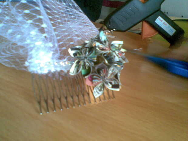 Recoger el velo en el patrón de pliegues que desea y azul la tachuela en el peine. Prueba y asegúrese de que está sentado vago derecho. Tachuela azul en el fascinador que seguro que es del tamaño correcto y posicionamiento.