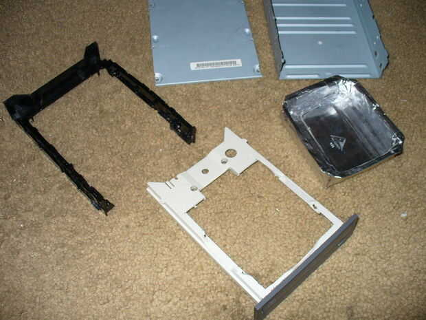desarmar todo el disco. usted necesitará solamente la carcasa exterior de metal, la bandeja del cd, la bandeja portaobjetos en lo y la placa frontal. Dremel de la parte frontal de la pieza de la bandeja portaobjetos en y corta un rectángulo grande en la bandeja del cd.