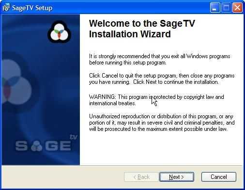 El SageTV instalación es muy simple y sencilla. Simplemente haga clic en el Asistente de instalación, dejando todas las opciones de configurar por defecto hasta que haya completado la instalación.