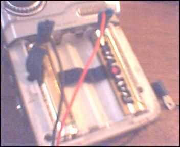 Luego cavado un adaptador de CA adecuado, que resultó para ser un cargador de teléfono celular de Nokia. Por el hecho de que la cámara originalmente utiliza 4 pilas AAA en serie, elegí este cargador ya que era el correcto voltaje (6v) y bajo amperaje. I corte el enchufe, despojado el aislamiento y desnudo sobre una pulgada o tan de cada cable. Me resbaló en los conectores y había prensado en su lugar usando las abrazaderas de tornillo. Reinserta los cables en sus respectivos puestos de trabajo, empalmar las baterías contra ellos para mantenerlos en su lugar.