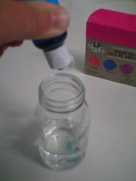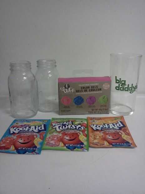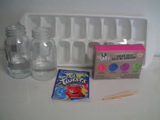 -Seleccionar varios colores de paquetes de Kool Aid o glaseado de colores. -Llenar el recipiente de cristal con sólo una pequeña cantidad de agua y agregar 1 color de su elección.