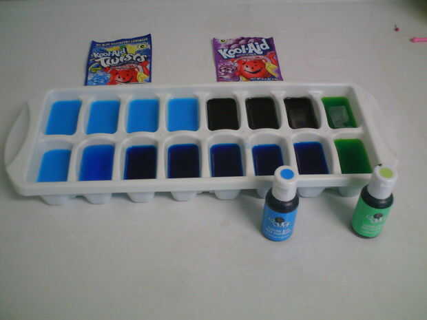 -Vierta el agua coloreada en Cubiteras y congelar