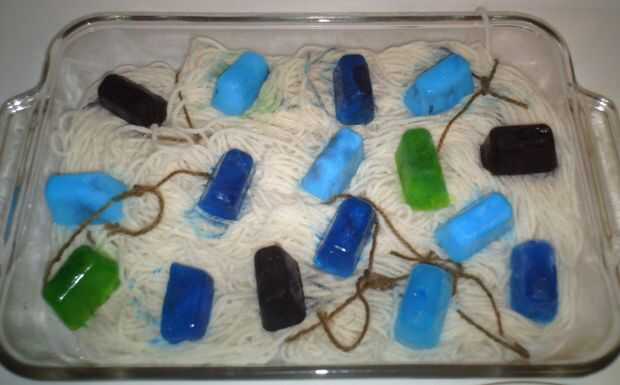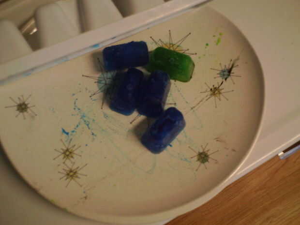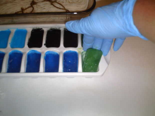 -Con cuidado coloque hilo en plato asegurándose de mantener la cola de hilo fuera el plato -Utilizar guantes, sacar un cubo de hielo coloreado (o volcar todo en un plato) y coloque en el hilo.