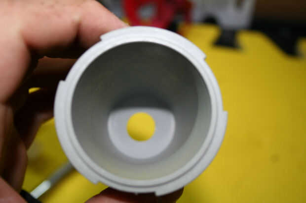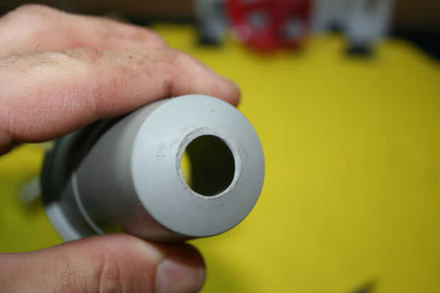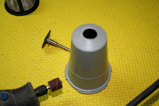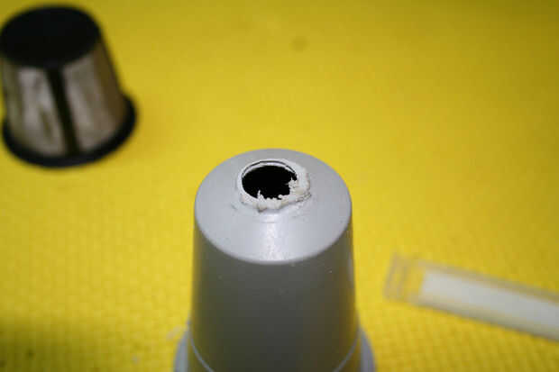 Ahora use la broca de la lijadora o una lima plana para limpiar el agujero. La parte inferior se curva pero queremos el acoplamiento del tanque para sentarse como plana como sea posible así que el anillo O hace contacto en la superficie externa.