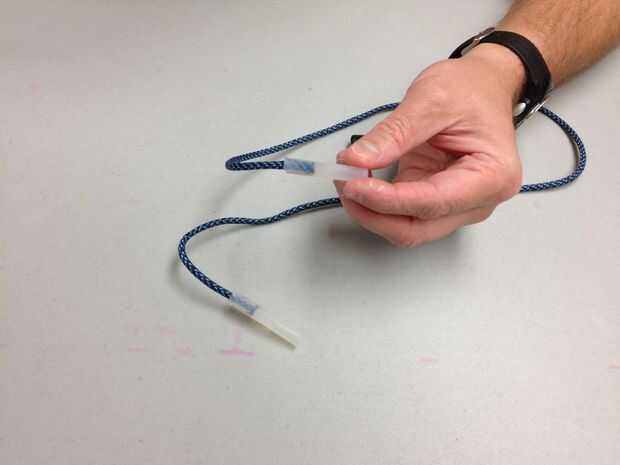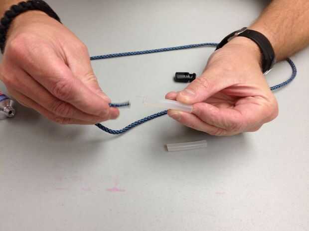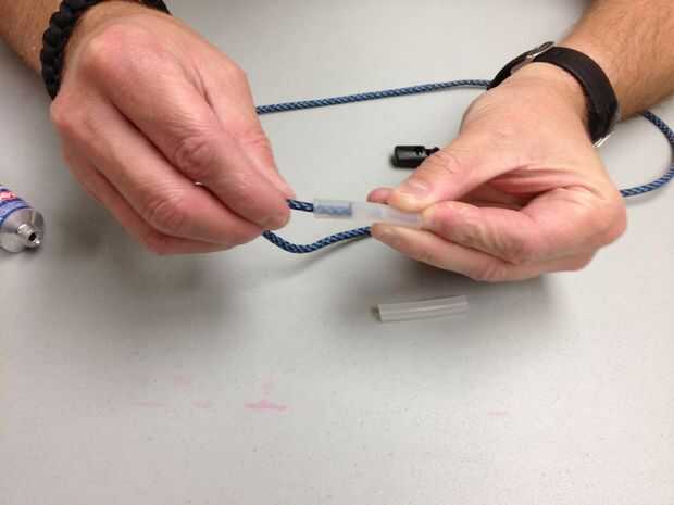 El adhesivo se forma alrededor de paracord, si después el pegamento se seca y el paracord se desliza hacia fuera cuando, repita este paso con las mismas piezas. El adhesivo puede no han llenado lo suficiente alrededor de la médula y no puede haber hecho un vínculo lo suficientemente bueno. Repetir este paso llenar las lagunas y hacer un mejor sello. También puede tratar de desbaste hasta el interior de los tubos con papel de lija (no mostrado). Otros artículos se pueden utilizar para fijar el extremo alrededor del paracord así.