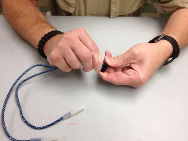 El paracord del doblez por la mitad y presionar el lazo por el agujero de la cerradura de la cuerda.  Esto puede tomar algunos moviendo para conseguir a través.  Pulsa el botón que libera el bloqueo necesita a la vez que es presionado el paracord.