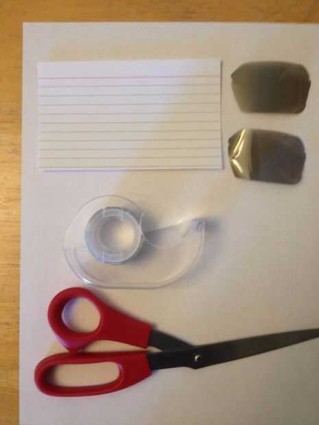 Materiales: tarjetas de 3 X 5, cinta transparente, tijeras y 2 lentes se recuperaron de un par de gafas 3D.