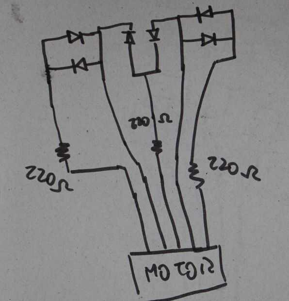 Ya que mi motor tiene un cable raro, he probado conectarlo a dos LEDs, estas yendo a otro circuito, como el pic. Funcionó bastante bien. También os adjunto lo que sería el circuito con salidas de par.