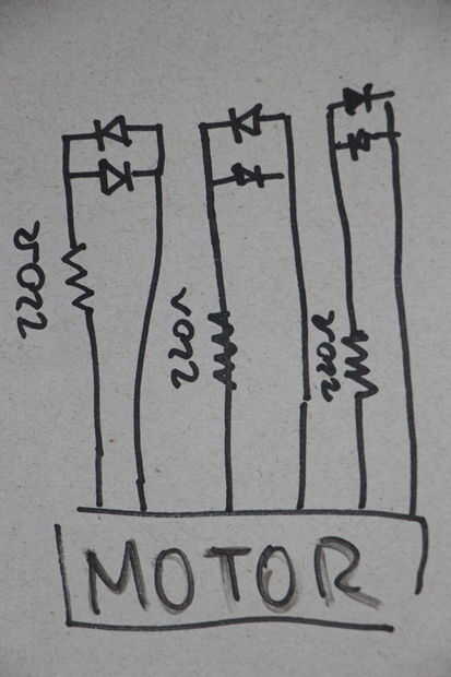 Una cosa a tener en cuenta es que dos cables dados tendrá la corriente que fluye en una dirección en un momento y en la dirección opuesta en el momento siguiente. Por lo tanto debe conectar dos LEDs en paralelo en las direcciones opuestas, para poder utilizar la corriente proveniente de ambos sentidos. La resistencia está ahí porque no sé cuánto voltaje el motor da hacia fuera, y temía que los LEDs se fríen si monté en alta velocidad. Puede conectar los LEDs sin ellos, pero no sé si te duran mucho.