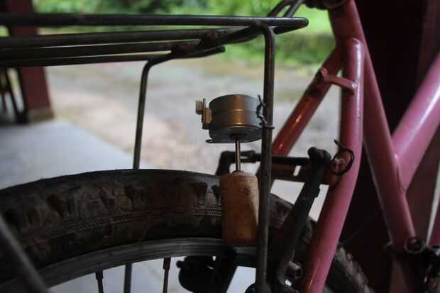 Esto fue realmente el más difícil parte. Utilicé una combinación de alambres, abrazaderas y 3 gomas. Las gomas de tirón desde el otro lado de la llanta así que hay suficiente presión entre neumáticos y corcho. También, pueden ser desenganchados cuando no desee que el funcionamiento de la dinamo. En restrospect, los amarres de cable funcionaba mejor porque son más fáciles de ajustar la distancia. No tengo muchos consejos además de eso, supongo que cada bicicleta requiere una solución diferente.