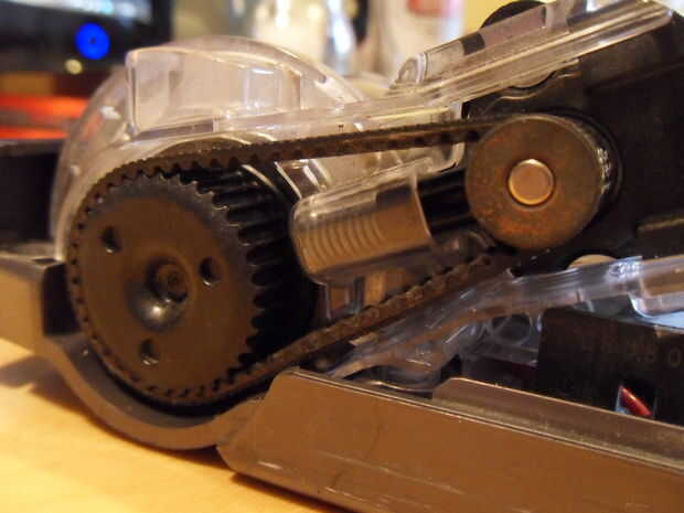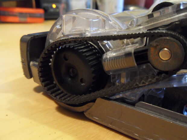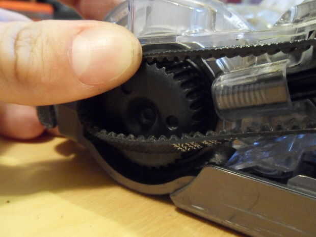 Una vez que los dientes participan en la parte superior, gire el cinturón para que cada diente entra en contacto con la correa y tira de. El motor a la corona grande y presiona el resorte también ayuda a aliviar la correa.