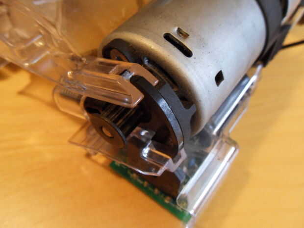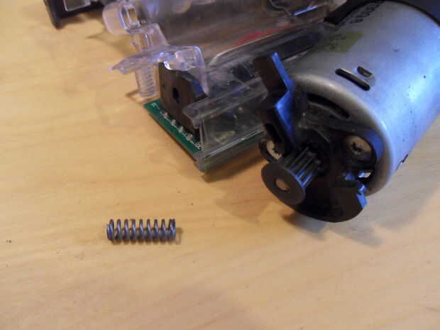 Levante la lengüeta de plástico para liberar el motor. Retienen la primavera, es propenso a volando en la dirección opuesta.
