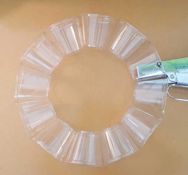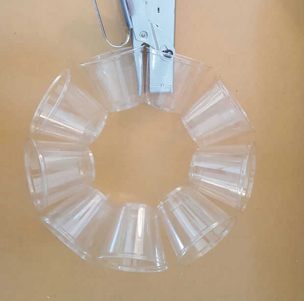 • Grapa 12 tazas juntos. Sus bordes se superponen. Profundo en las copas de la grapa. Si esto no hace un círculo ordenado agradable, las tazas no son del tamaño correcto. :(