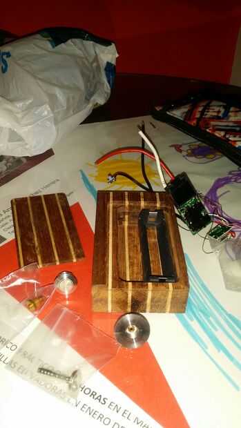 Una vez hechos todos los agujeros pasamos a montar los componentes, pasamos los cables por los agujeros, atornillamos el cabezal y el pulsador y soldamos todos los cables tanto al pulsador como al cabezal y el porta baterías, no pongo esquemas por hay muchos por Google. Comprobamos todo funciona y si todo va bien pegamos la tapa del chip con cola y el porta baterías yo lo pegue s con resina epoxi.