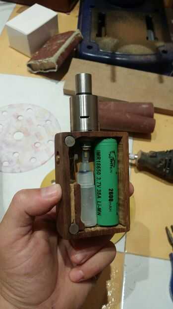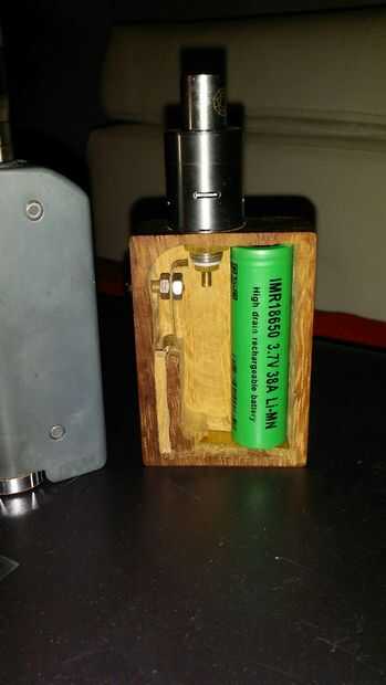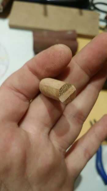El pulsador y la tapa los hice con tres maderas diferentes, el pulsador pegue s las maderas, una vez pegadas les hice un agujero en el centro le metí el espárrago con un poco de cola y cuando se seco lo puse en el taladro de columna y mientras daba vueltas lo lijaba, y así a quedado, luego lo atornille con dos tuercas a la chapa en el agujero hice anteriormente.