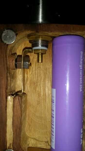 tomamos medidas, cortamos, abrimos hueco con la fresa, con la broca de 3mm hacemos agujeros por donde va a ir la chapa de latón repasamos el hueco con un formon, hacemos los agujeros para el pulsador y el cabezal, cortamos la chapa de latón o cobre una medida le damos la forma y le hacemos un agujero para atornillar el pulsador , en la parte donde hace contacto con la batería yo le di con el martillo y un nivel de estrella para en ese punto quedará en aliviar para haga buen contacto con el negativo de la batería. metemos la chapa en su sitio y en el hueco hicimos con la broca de 3mm le metemos un trozo de madera de 3mm y la pegamos para la chapa no se mueva.
