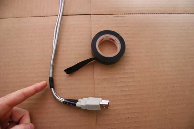 Doble de la lámpara y brazos ventilador 90 grados así como señalan a Dios una vez enchufado en los puertos USB. Cinta otra vez directamente encima de la curva.