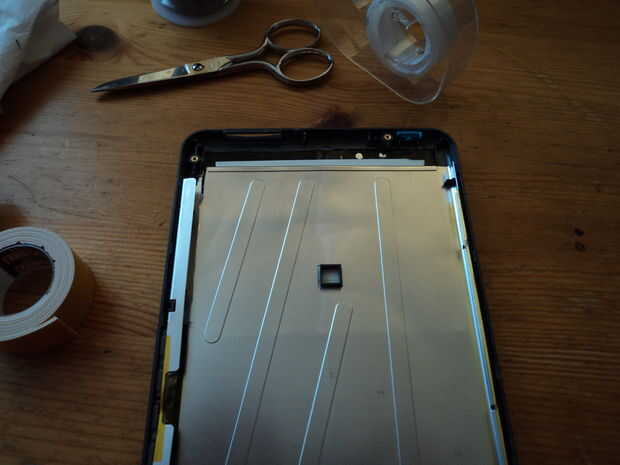Uso algunos fuerte acolchado cinta de doble cara para fijar los paneles a la protección de metal. Asegúrese de que las almohadillas de soldadura que desee conectar el extremo para arriba en la parte superior y no está cubiertos en la cinta. El kobo tiene un pequeño espaciador cuadrado en el centro de la tapa posterior; cortar el trozo que sacó de la caja y pegar esta regreso a su lugar correcto.