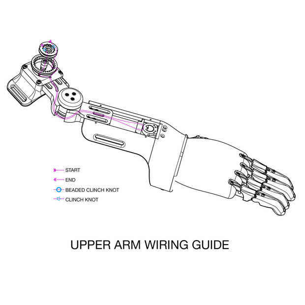 - Enrosque el filamento a través de la bisagra de la parte superior del brazo, luego a través de la bisagra inferior del brazo, utilizando la herramienta de roscado en un paso anterior para ayudarle.