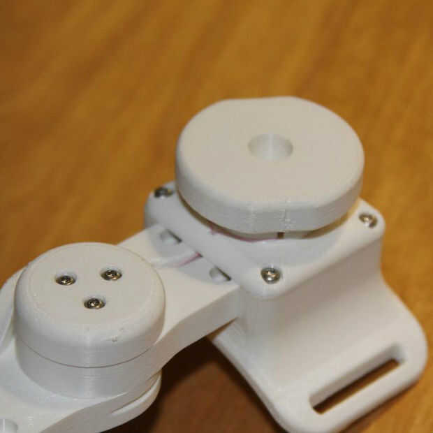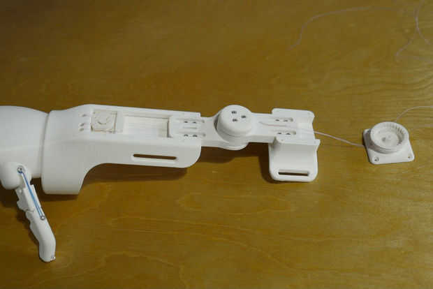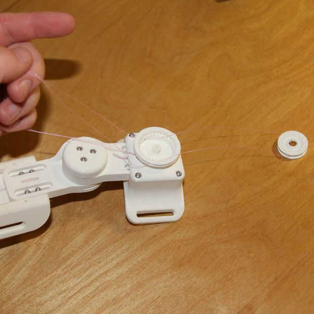 - Enrosque el filamento a través de la bisagra inferior de brazo, luego la bisagra de la parte superior del brazo, utilizando la herramienta Roscadora para ayudarle.