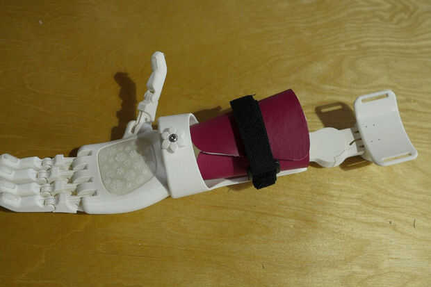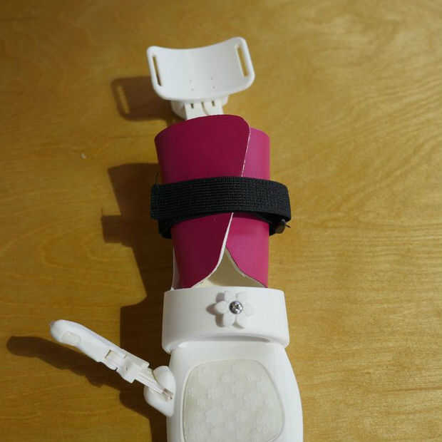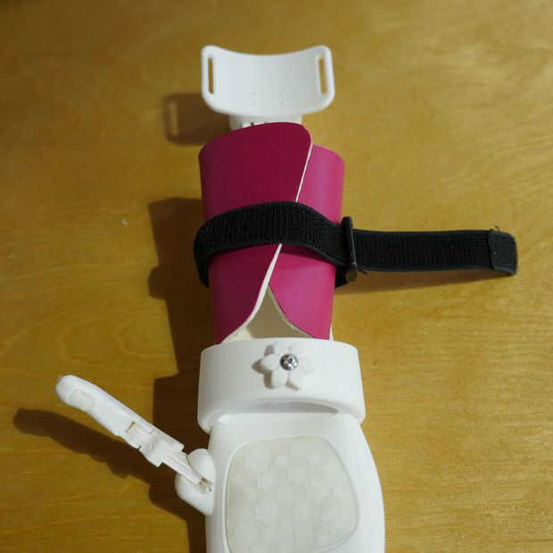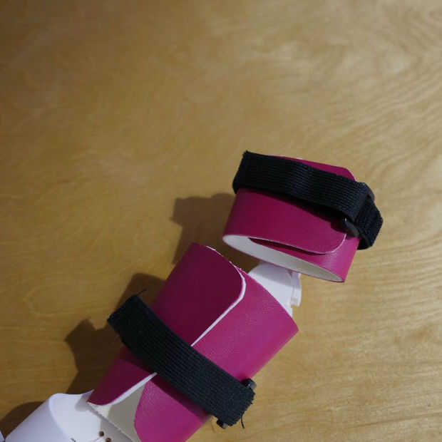 Instale las correas de velcro y espuma forrado en piel acolchado sobre el guantelete y el brazalete superior del brazo, con el lado suave del relleno mirando hacia adentro y el colorido cuero hacia afuera. Opcionalmente, use un exacto para cortar ranuras en la espuma forro de cuero para pasar la correa por la espuma forrado en piel. Esto puede ayudar a garantizar el relleno de la prótesis.