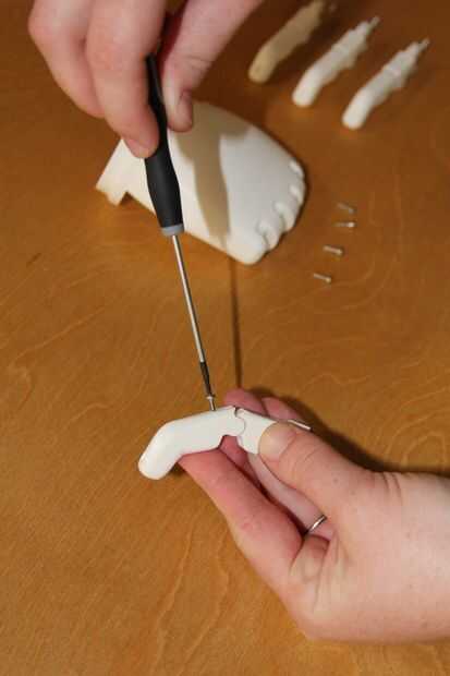 3. La palma tiene un orificio piloto de 1, 5 mm de diámetro en la base de cada dedo. Utilice un destornillador de torx T6 para instalar un tornillo del plastite M1.91 sobre la palma en la base de cada dedo.