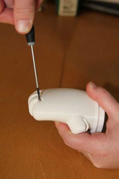 1. Cada dedo tiene un orificio piloto de 1, 5 mm diámetro en la parte superior el dígito distal. Utilice un destornillador de torx T6 para instalar un tornillo del plastite M1.91 en cada dedo.