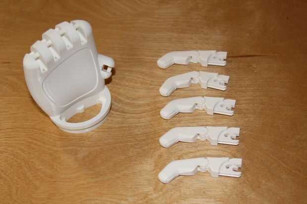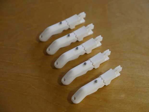 La Isabella Arm por FATHOM utiliza elásticos dentales para mantener un agarre abierto. Plastite tornillos se utilizan para fijar los elásticos a los dedos y Palma.