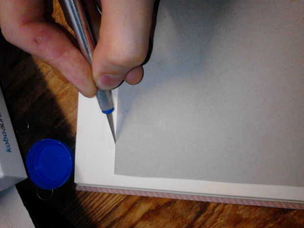 Ahora trace la plantilla con su hobby / cuchillo del exacto! sacar la pieza cortada y corte el agujero en la página siguiente. Mantenga este ir hasta el corte de páginas para agregar sobre el grueso de su e-reader.