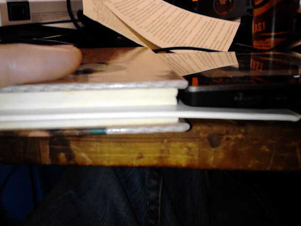 Coloque el libro boca abajo sobre la mesa, abra la cubierta trasera y coloque la plantilla en la segunda a la última página (voy a explicar por qué en el paso siguiente). Asegúrese de que su centrado a lo largo pero un poco apagado centro hacia el exterior en el eje horizontal. Esto es para dar cabida a la columna vertebral, con libros ponen la impresión más lejos el borde interior que el exterior.
