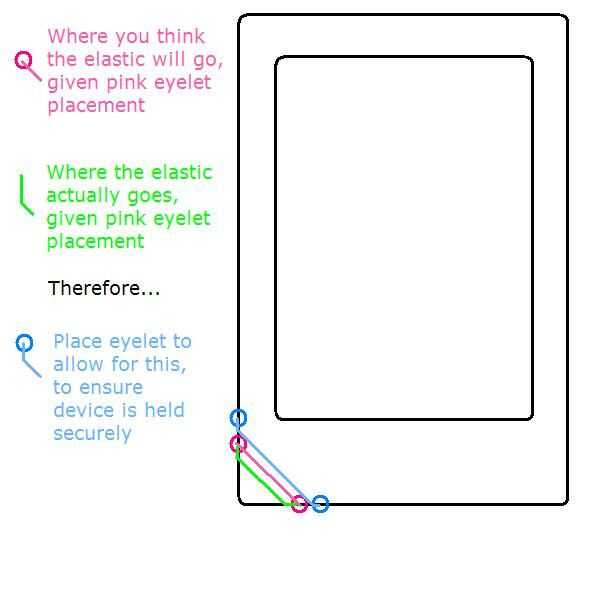 El dispositivo se lleva a cabo en la cubierta por un arreglo particular de elástica que se rosca a través de orificios en la parte posterior de la cubierta. Los agujeros se impidieron deterioro mediante la adición de ojales. El elástico se arregla de tal manera que sujete bien las esquinas del dispositivo.