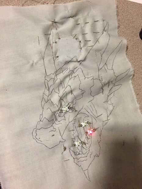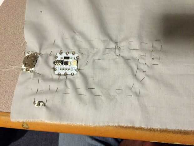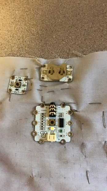 Para obtener la mayor parte de la electrónica en primer, cosí en el tablero de iglú primero; no importa que camino se coser, pero te recomiendo poner la batería en después el iglú, así que usted podrá comprobar si las conexiones están bien. Después de la batería, cosí un solo LED y el interruptor.