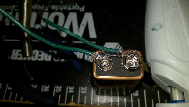 Cinta de uno de los extremos pelados de la hebra de luz de Navidad a la salida correcta de la batería de nueve voltios. Luego tomar el alambre extra y conéctelo a la salida de otros. Prueba su circuito antes de grabar para que usted sepa de qué lado de las luces de Navidad es negativos o positivos para que funcione el circuito. Empuje la batería y los cables conectados a través del agujero que usted cortó en el lado de la botella. Cinta de la batería en su lugar en el agujero. Introducir el extremo restante del filamento de la luz a través del agujero que es perforado en la parte superior de la tapa. Luego alimentar el extremo pelado del cable a través del orificio en el lado de la tapa. Asegúrese de que es sólo a través de la tapa, nit de la parte superior de la botella. Sería algo así como un lazo en la parte superior de la tapa.