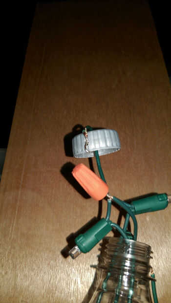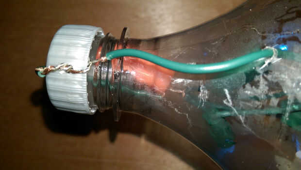 Poner el cable adicional a través del orificio en la parte superior de la botella. Tomar la que mismo alambre y empujar a través del orificio en la parte superior de la botella mientras se asegura que es el lado pelado del cable en ambos lados del agujero. Ahora tienes un interruptor de giro. Cuando gire la tapa que va a tocar los cables y el circuito pondrá en. Alternativamente podría atar un nudo en el cable para que no tire hacia atrás a través del orificio. Es importante mantener algunos de los cables expuestos en la parte exterior de la botella.