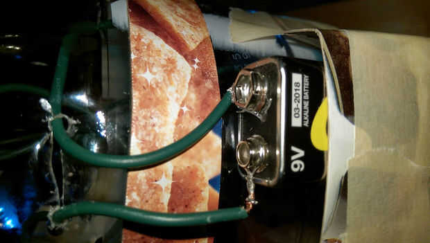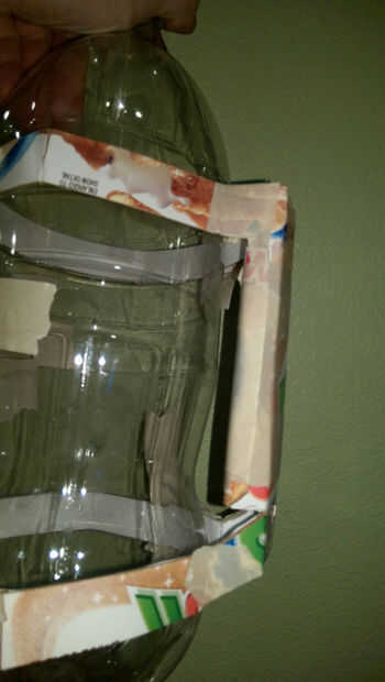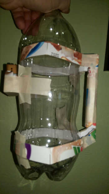 Tomar el mango que corte antes. Doblar según las indicaciones, envuelva las tiras de largo todo el camino alrededor de la botella y la cinta en el otro extremo. En uno de los cuadros se muestra el montaje externo opcional de la batería de 9 voltios. Este poco de peso extra puede hacer que su punta linterna así que ten cuidado.
