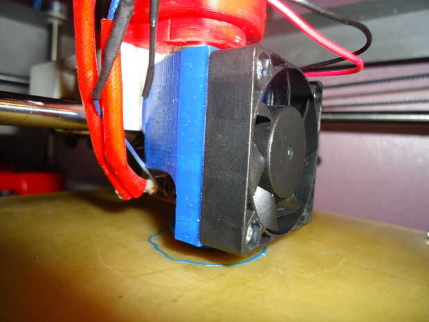 Quería algo para enfriar el plástico que sale de la boquilla pero no quieren ser voluminosos ya que mis impresoras es un poco pequeñas y no quería hacer más pequeño el volumen utilizable. Así que reemplacé la pieza stock con mi propia y el ventilador de stock con un 40mm uno. Básicamente es la pieza de stock pero en la parte inferior el aire es dirigido hacia la boquilla.