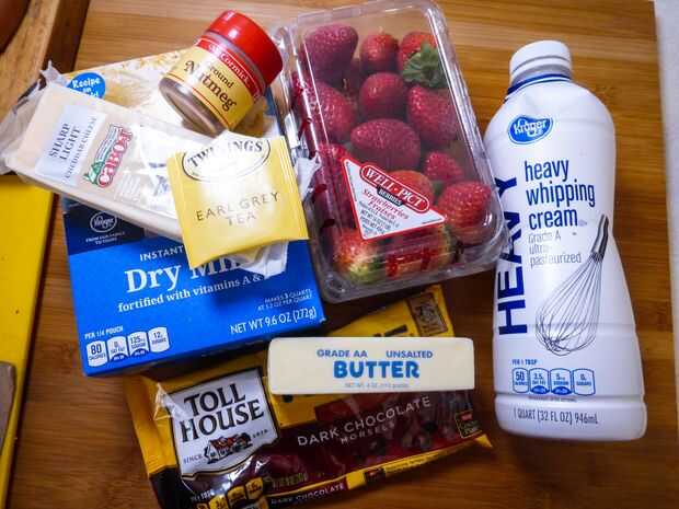 Earl Gougeres Grey con Chocolate oscuro, blanco Cheddar y fresas (1 / 8 paso)