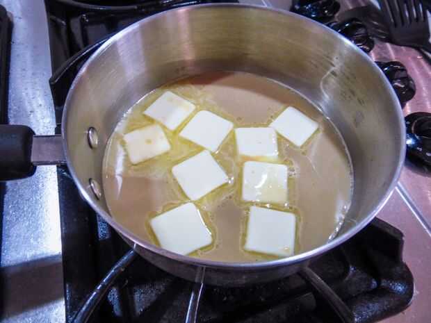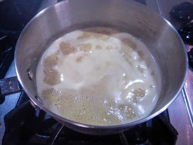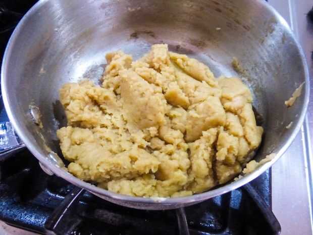 Vierta el té en la cacerola, incorpore la leche en polvo, añadir la mantequilla y la sal y poner la totalidad del lote a hervir en la cocina. Mezclar la harina con una espátula de goma. Reducir el fuego a bajo y seguir revolviendo hasta que la masa se seca y se desprenda de la cacerola.